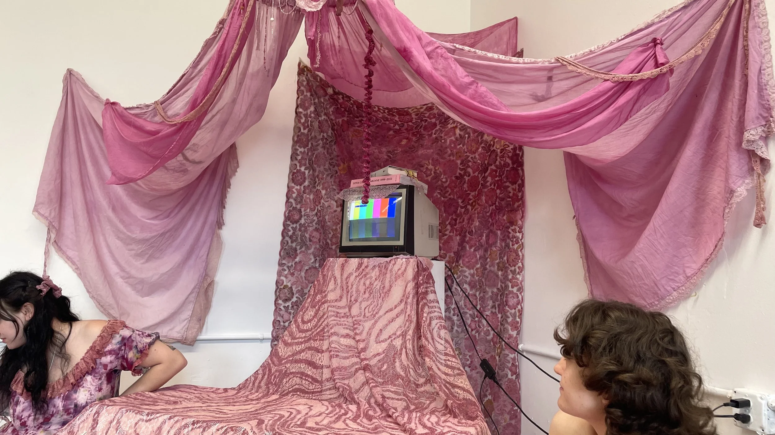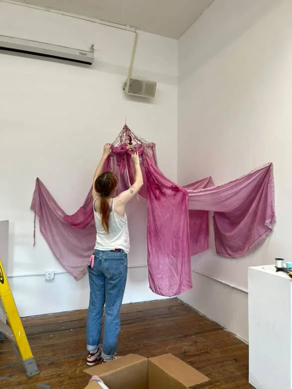 Materials: Lace curtain, handmade natural pigment paint; cochineal, weld, logwood, madder